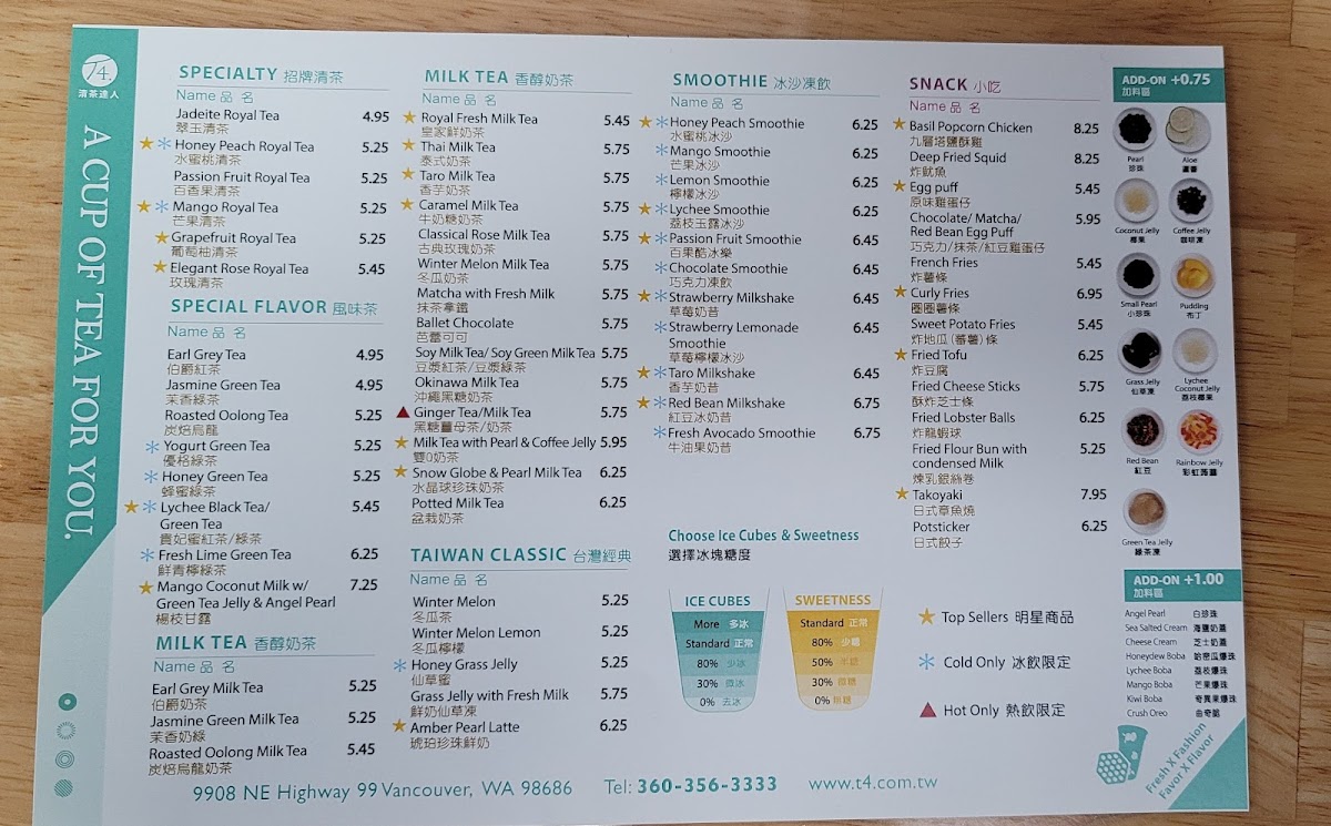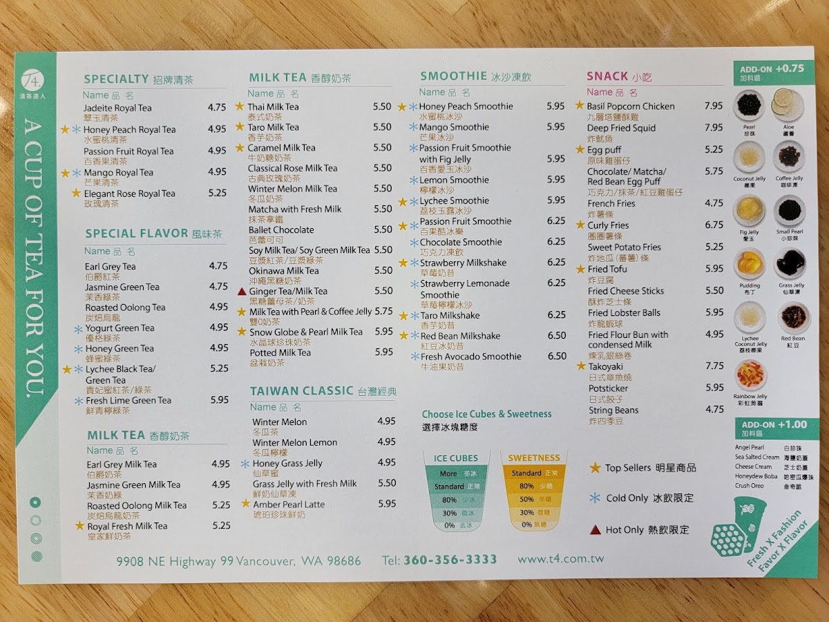 Welcome to T4 Vancouver, a vibrant café located at 9908 NE Hwy 99, Vancouver, WA 98686. This beloved boba tea spot is not just a drink destination, but a welcoming retreat for anyone looking to indulge in delightful flavors and a cozy atmosphere. With a menu filled with specialty drinks that showcase Taiwan's rich beverage culture, T4 has earned its place as a local favorite.